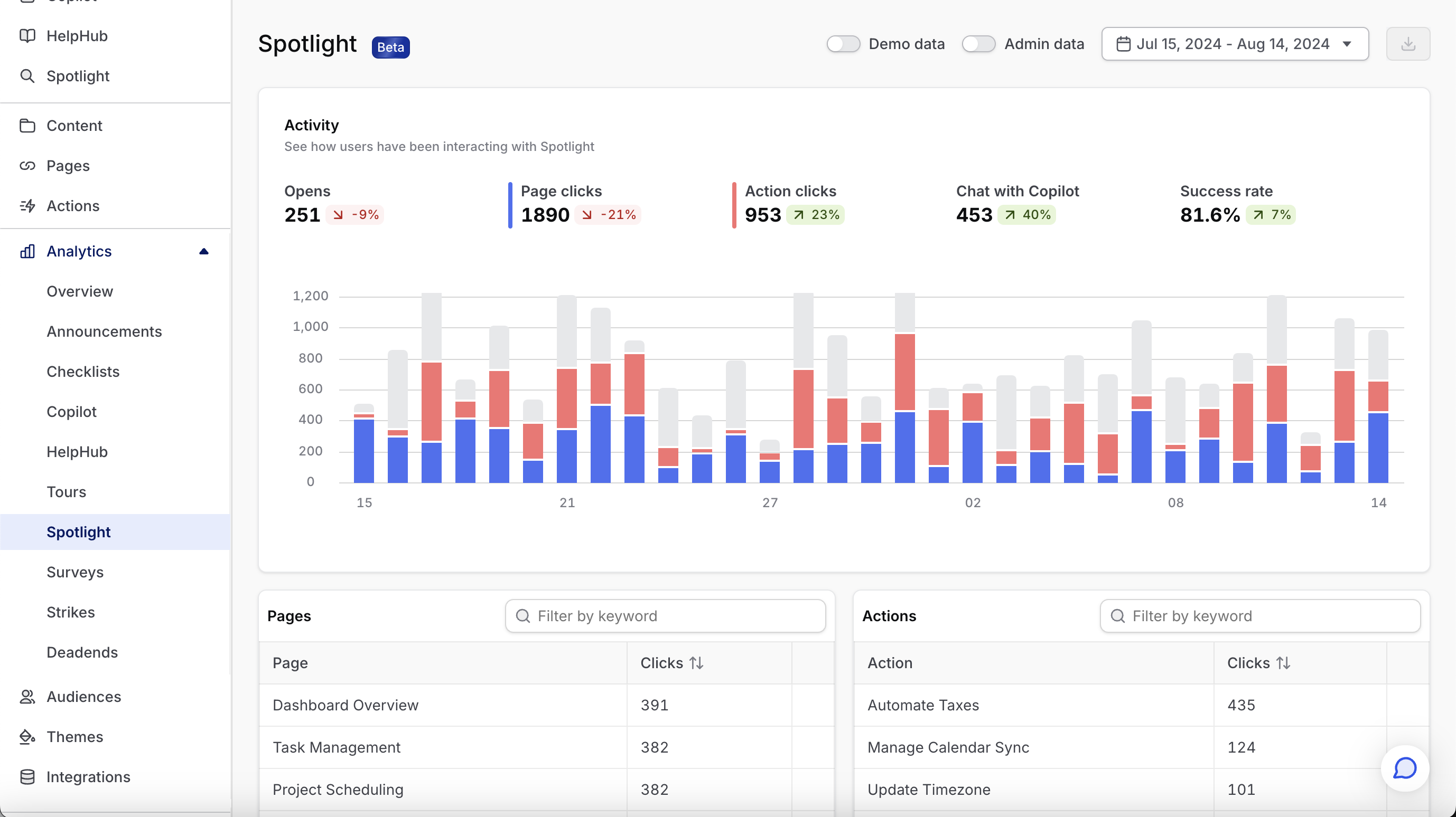 Check our your analytics dashboard to see how users are engaging with Spotlight. An especially interesting page is the Deadends page, which shows you unsuccessful queries. This is the goldmine of user intent we were talking about earlier!